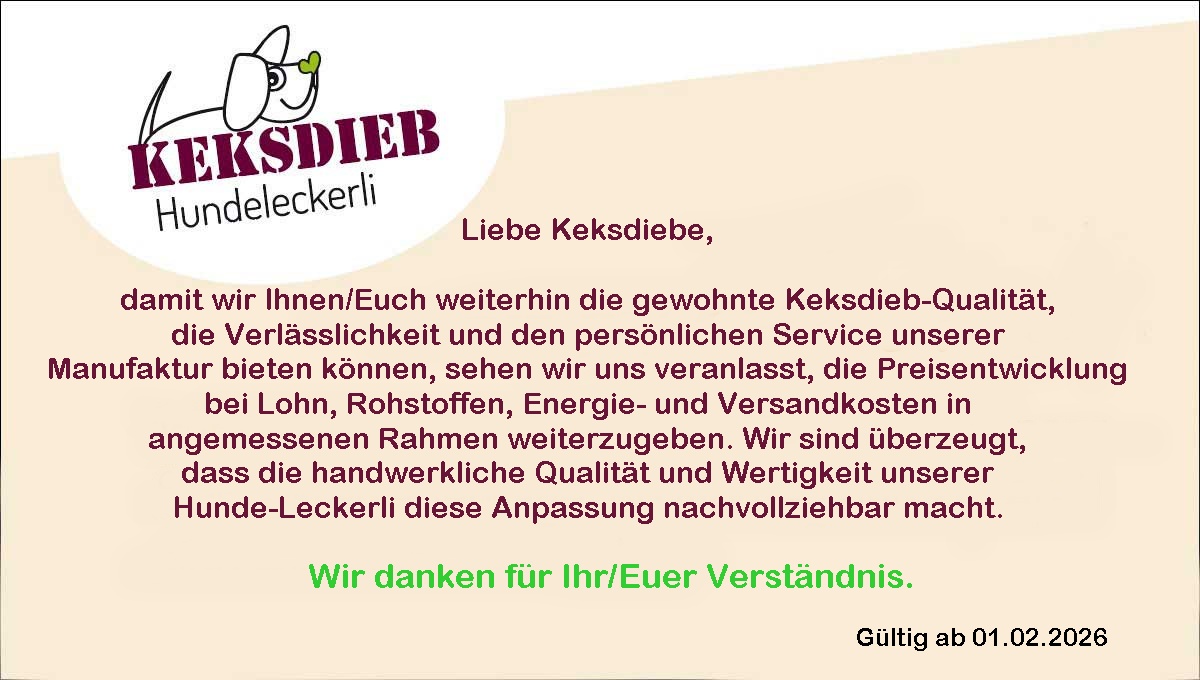 Keksdieb-Leckerli sind ohne Zusatz von Chemie, Weizen oder Füll- & Lockstoffe. Unsere natürliche Zutaten in Lebensmittelqualität garantieren, dass Ihr Hund nur das bekommt, was für ihn bekömmlich ist.