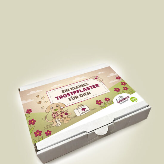 Die Leckerli-Box „Ich denke an dich“ ist gefüllt mit unseren Rinder-Fitis und mit unseren Kaninchen-Stangen. Zudem beinhaltet sie eine Keksdieb-Postkarte und eine Verschluss-Klammer für unsere Leckerli-Tütchen.